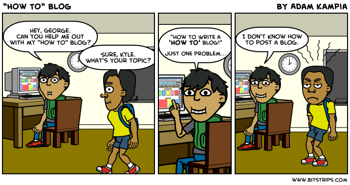 So with a digital camera or a little video editing, they could create some really great How-to blogs. My former student's skateboard demonstration would have been a lot safer that way. What's great is that there are plenty of examples available to show them. Maybe I'll make a video blog example next time I have to fix a toilet...or maybe not (the language may border on PG-13).